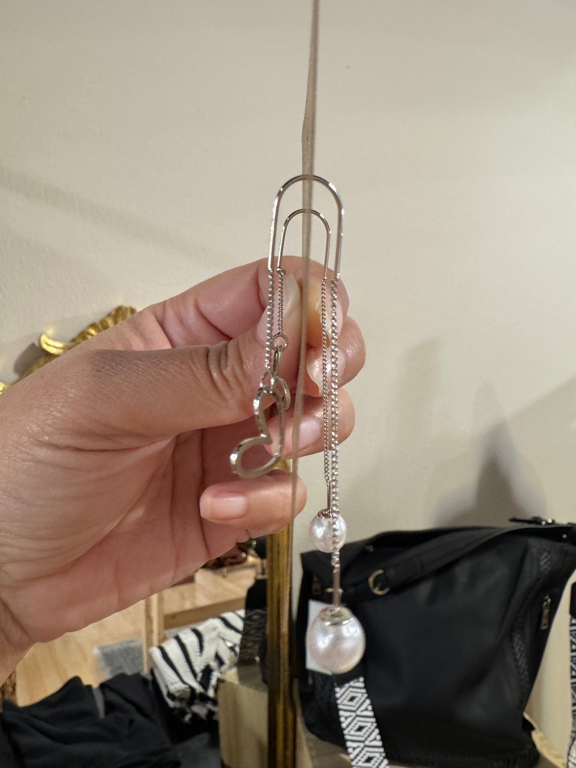 Silver color threaders adorned with a small silver heart on one side, and a pearl on the other.
