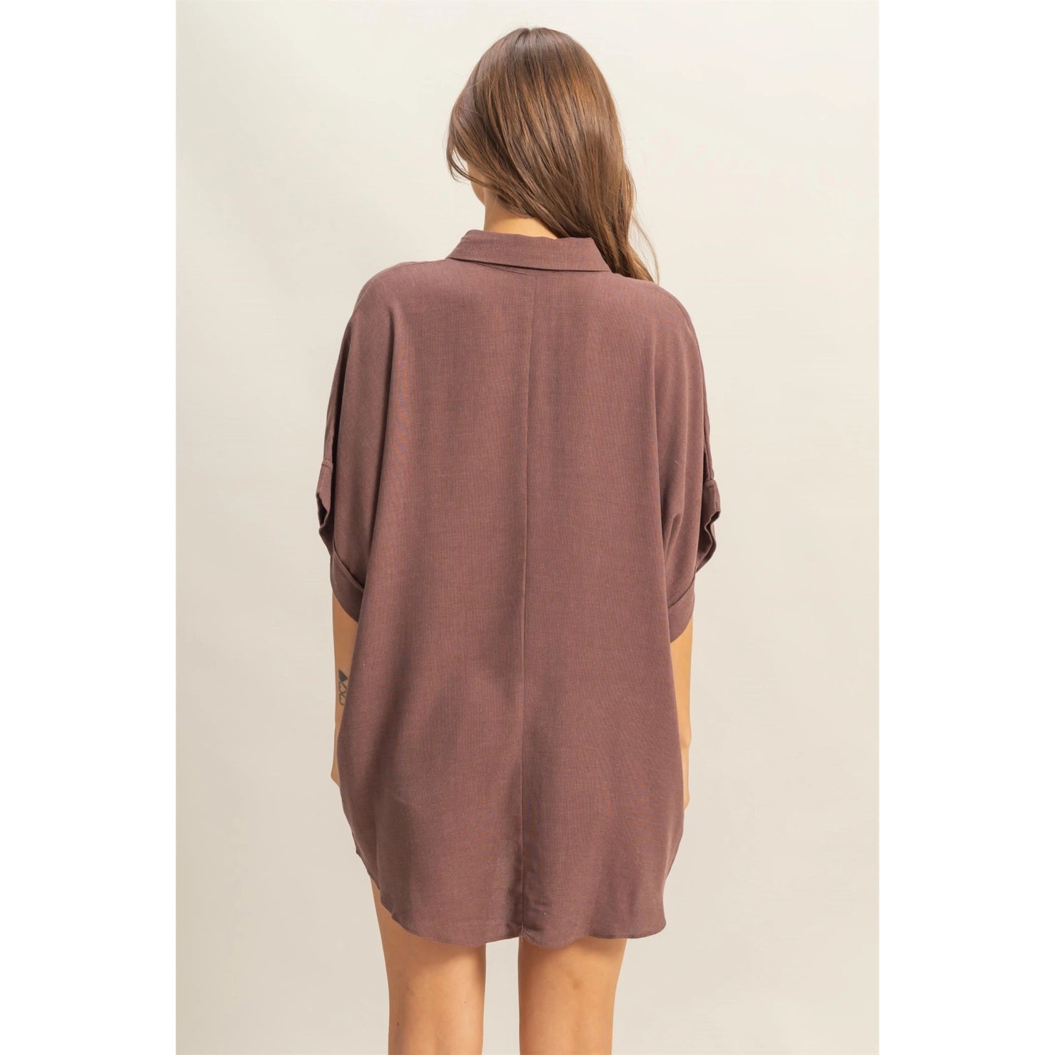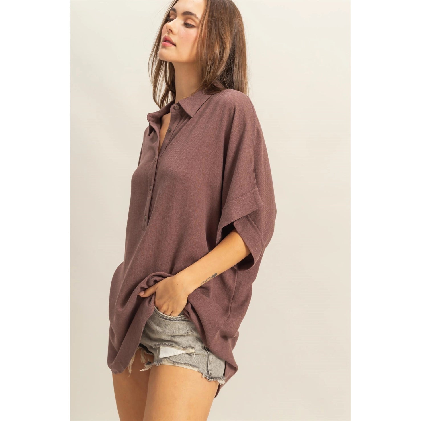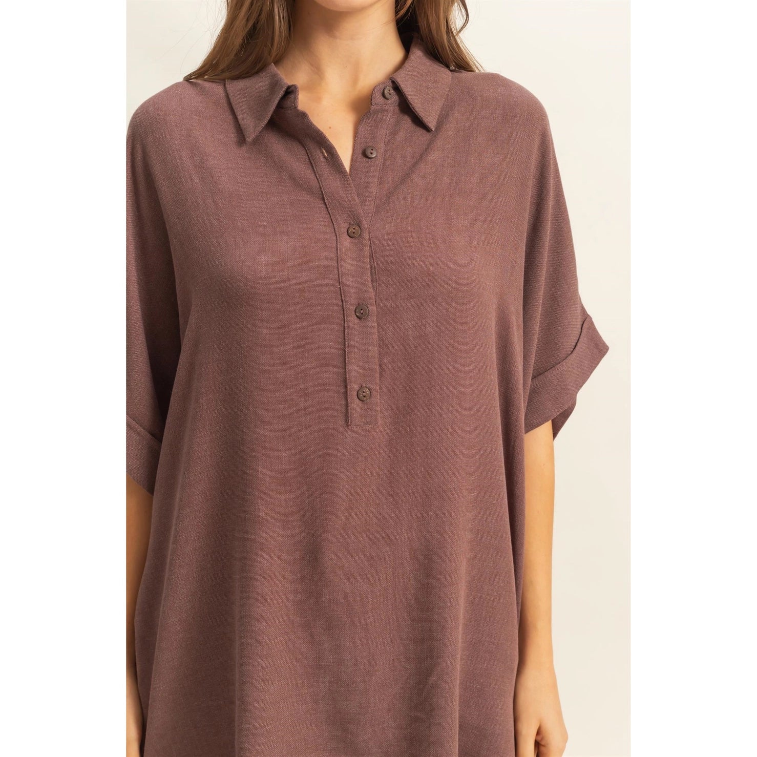 Showcase Your Stylish, On-The-Go Look! The Dropped Shoulders, Along With The Elbow-Length Sleeves On This Oversized Top, Enhance The Boxy Cut. The Collared Neckline Is Featured With A Half-Buttoned Placket That Gives It A Chic Look.